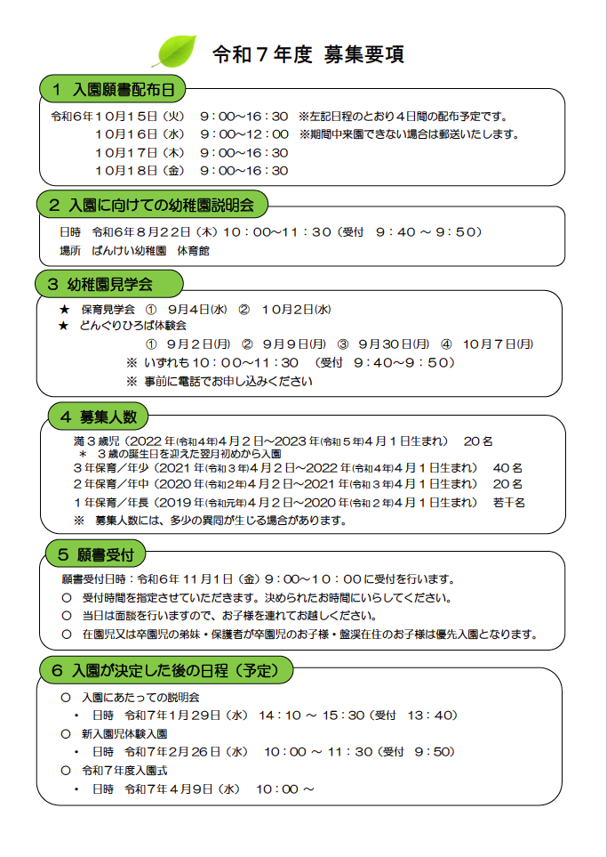 ○ 在園児又は卒園児の弟妹・保護者が卒園児のお子様・盤渓在住のお子様は優先入園となります。