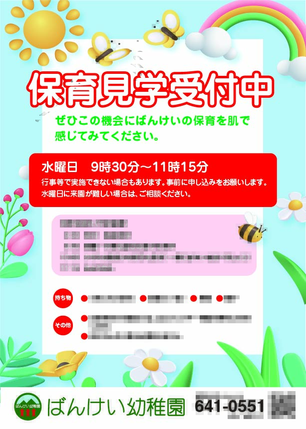保育の様子や園内の環境をご覧いただけます。事前に電話でお申し込みください